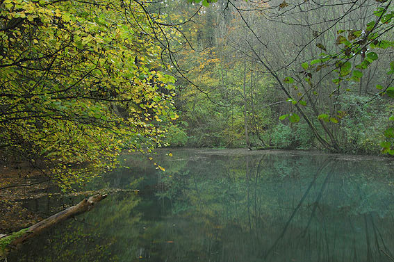 < vorheriges Bild | Übersicht | nächstes Bild > Der "runde Weiher" im Frühherbst. Bläulich schimmert das aus mehreren Karstquellen gespeiste kalkhaltige Wasser. Karstquellgebiete sind in Deutschland eine Besonderheit.