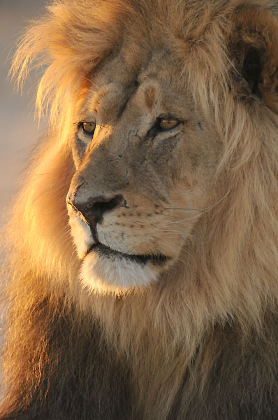 < vorheriges Bild | Übersicht | nächstes Bild > Ein Löwenmännchen geniesst frühmorgens die ersten Sonnenstrahlen. Mit ihrer dunklen Mähne zählen die Löwen der Kalahari zu den schönsten Afrikas.